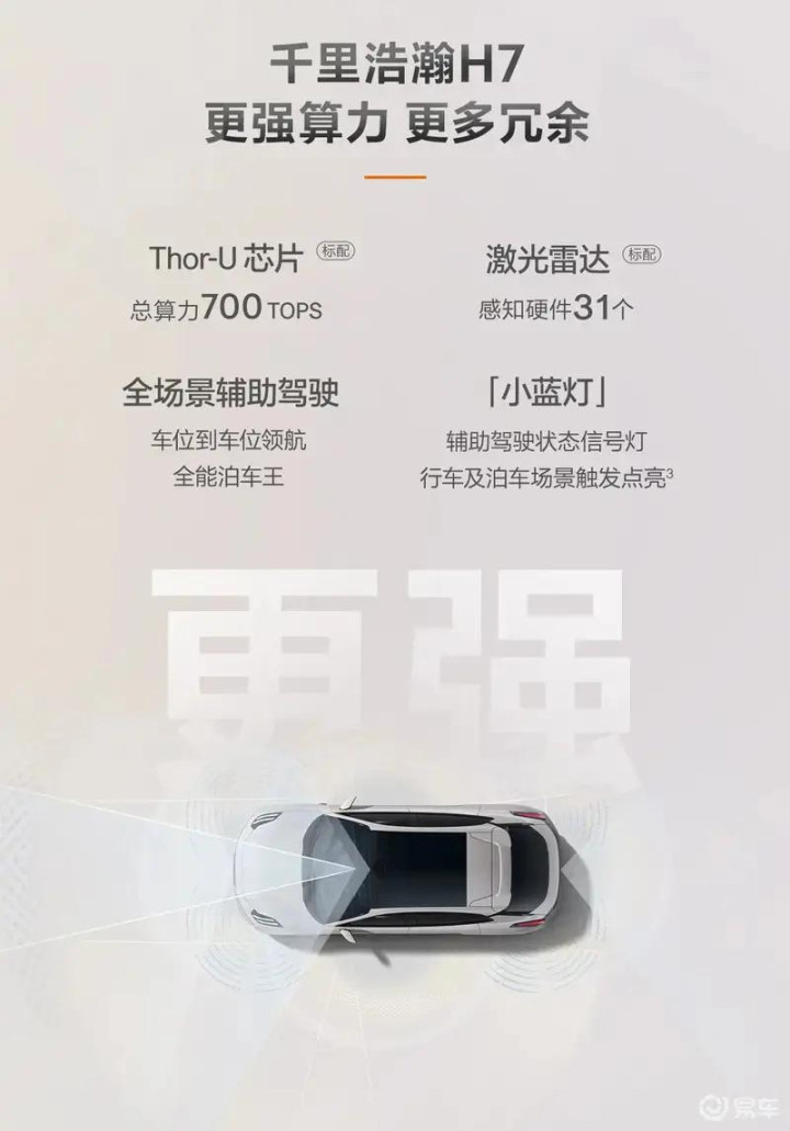 新车搭载Thor-U芯片,总算力700TOPS,标配激光雷达,全车感知硬件达31个。支持车位到车位领航,拥有辅助驾驶小蓝灯,行车及泊车场景可触发点亮。
