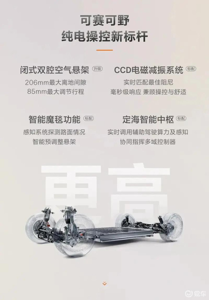 新车配备闭式双腔空气悬架,最大离地间隙206mm,最大调节行程85mm。全系标配CCD电磁减振系统、智能魔毯功能和定海智能中枢。
